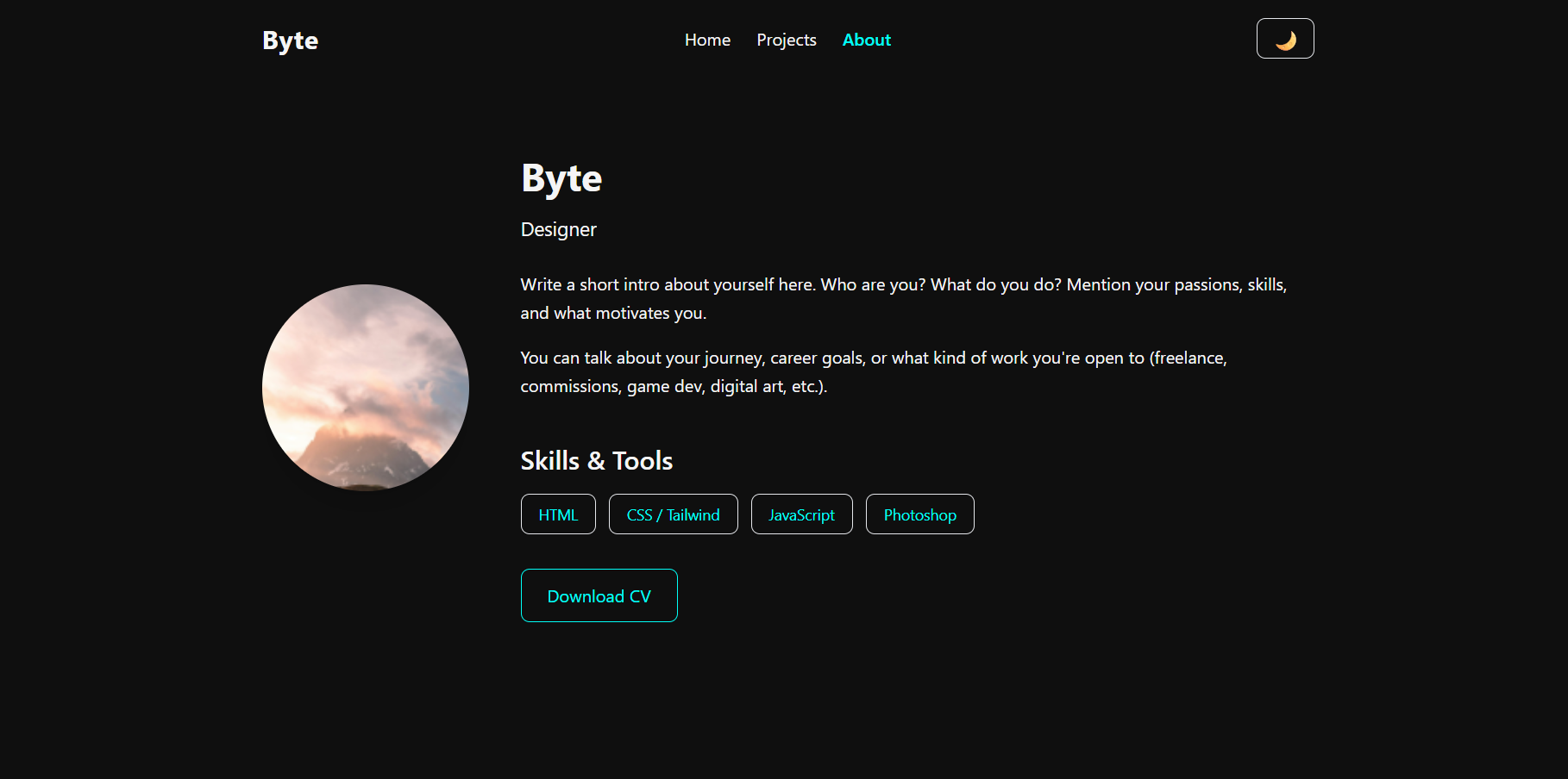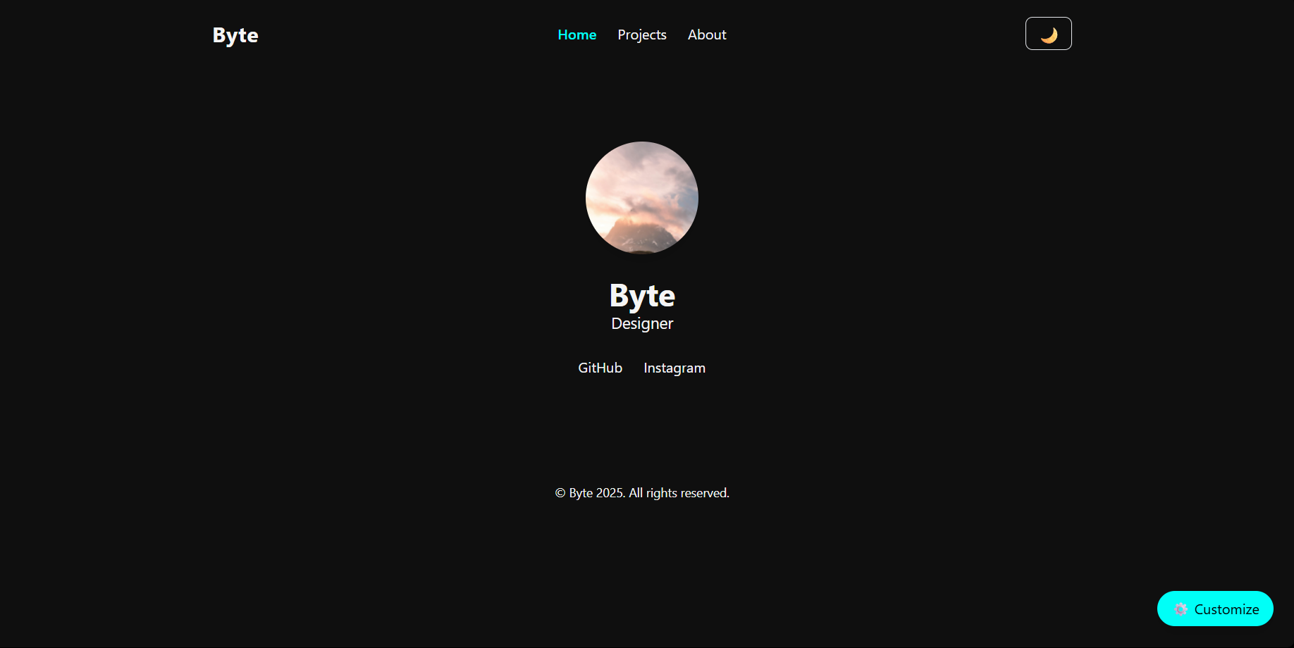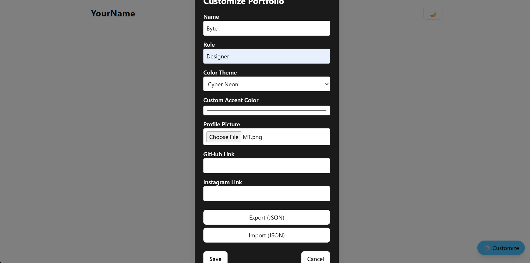This project is a fully customizable portfolio website template built using HTML, Tailwind CSS, and JavaScript. It includes three main pages: Home, About, and Projects. The user can easily personalize the portfolio without needing to edit the code directly, thanks to a built-in customization panel. From the website itself, the user can change their name, role, profile image, social links, accent color theme, and toggle light or dark mode. All settings are automatically saved in the browser using localStorage, meaning they stay applied even after refresh.